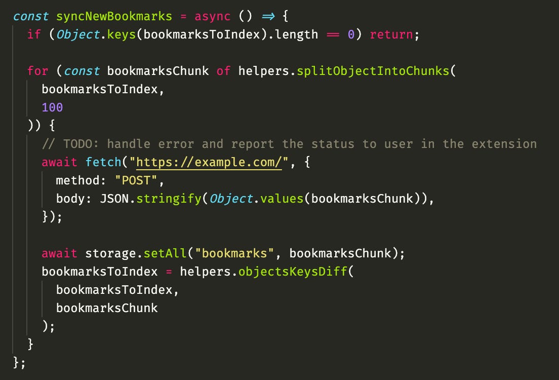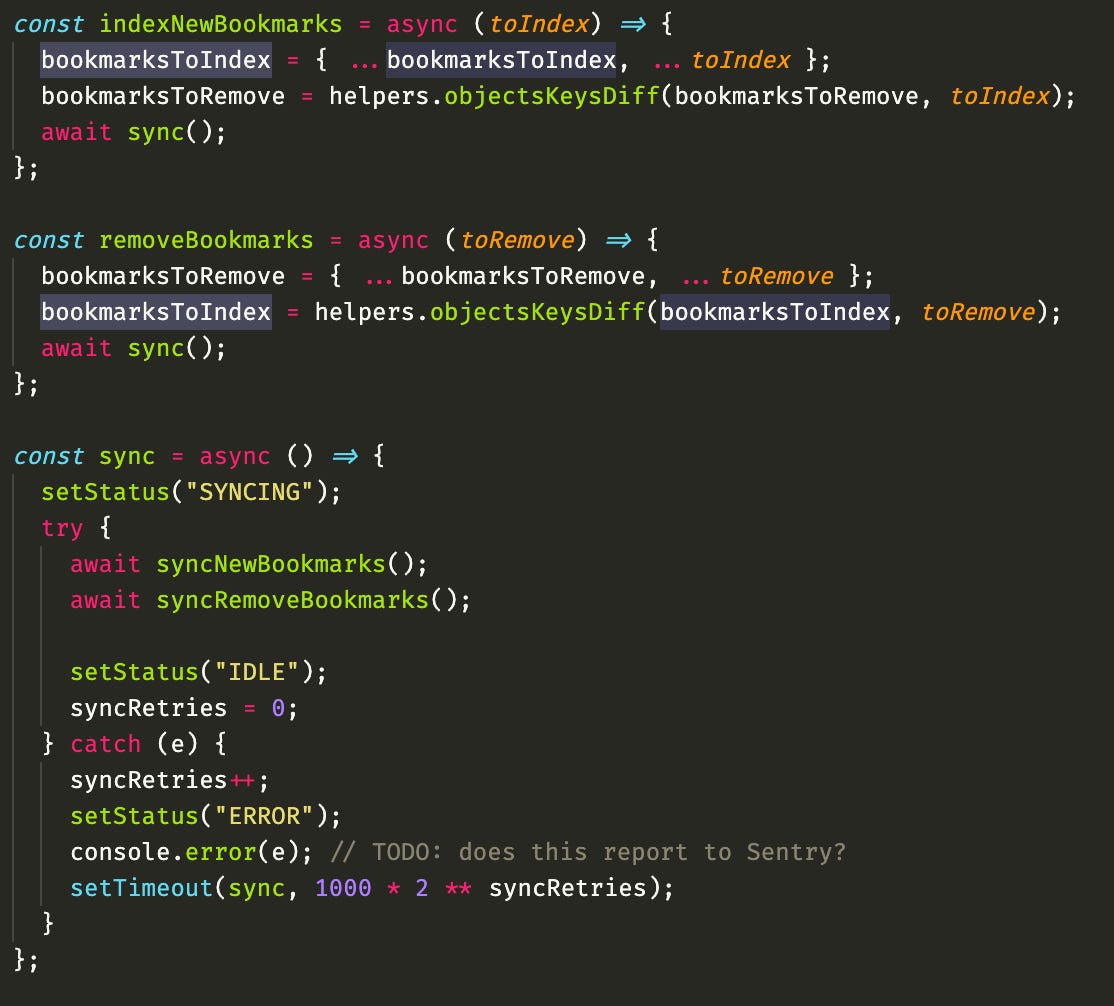 The idea is that if any error happens, I can just set a timeout to call sync again, with an exponential backoff, if some error happens, it will keep trying until it works, with time spread getting longer and longer, at the same time, other processes can run in parallel, and keep adding bookmarks to this "queue", waiting for a sync to work.