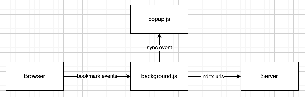 The background script listen to browser events, whenever a bookmark is added or removed (with a full sync on start), the background script then sends the links and titles of those bookmarks to Omnindex server, where we will crawl and index it.