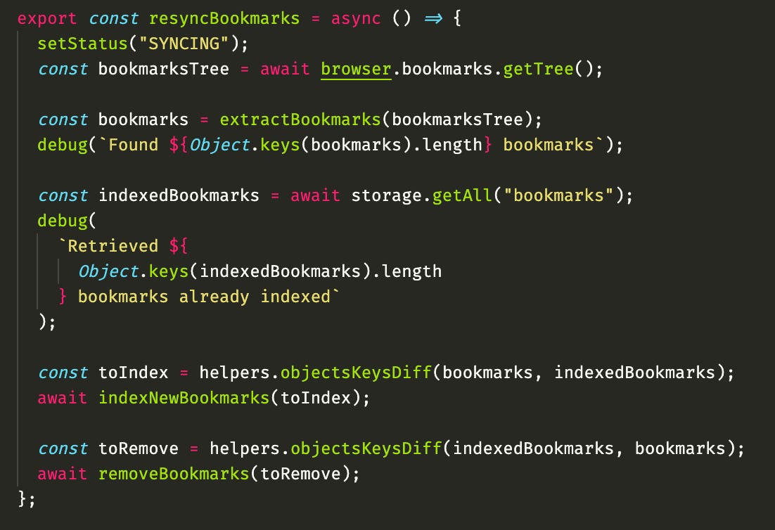 Notwithstanding, I also want to sync deletes, this is a bit tricky because it's not just about listening to bookmark delete events, it could be the case that the user deletes a bunch of bookmarks on their mobile phone, and then when they fire up the browser on the computer, it's already gone, no events. So, my plan is to use localstorage to know what I already synced, and then use it as a diff when syncing, whatever is saved but don't exist in the browser anymore, means I want to delete it, the browser is my source of truth.